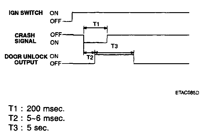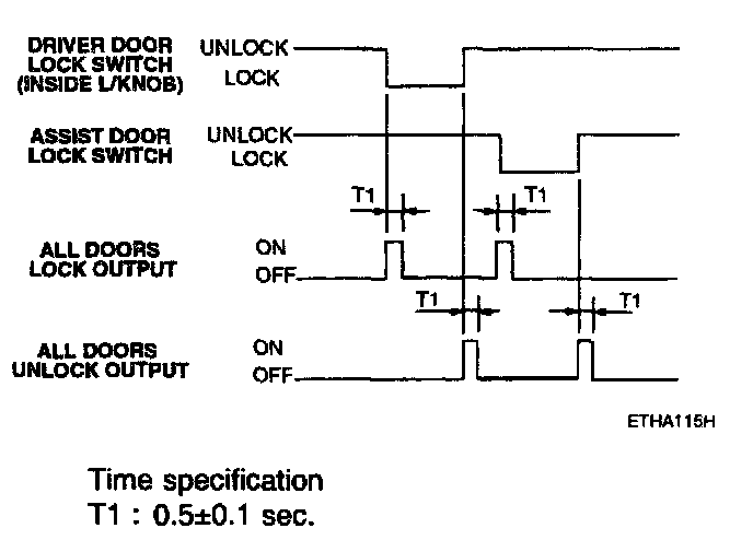 2. If the driver's door unlock switch or the assist door unlock switch is OFF to ON, the all doors' unlock output is ON for 0.5 second, (without burglar alarm system)
