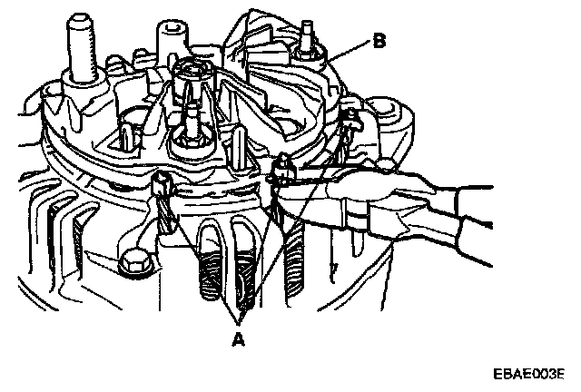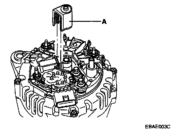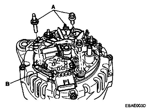 3. After loosening the 3 mounting bolts(A), detach the brush holder assembly(B).
