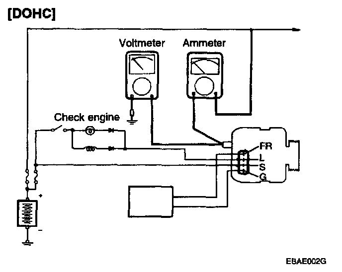 1. Check to see that the voltmeter reads as the same value as the battery voltage. If the voltmeter reads 0 V, and the open circuit in the wire between the generator "B" terminal and battery (-) terminal, a blown fusible link or poor grounding is suspected.