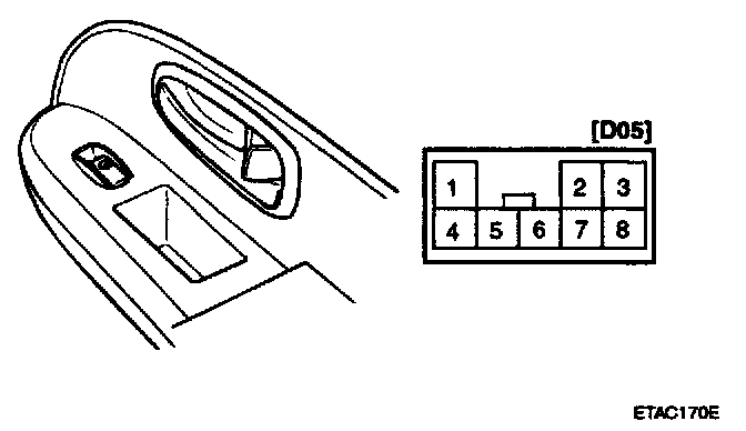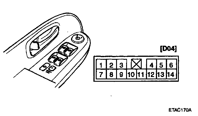 2. Check for continuity between the terminals. If continuity is not as specified in the table, replace the power window switch.