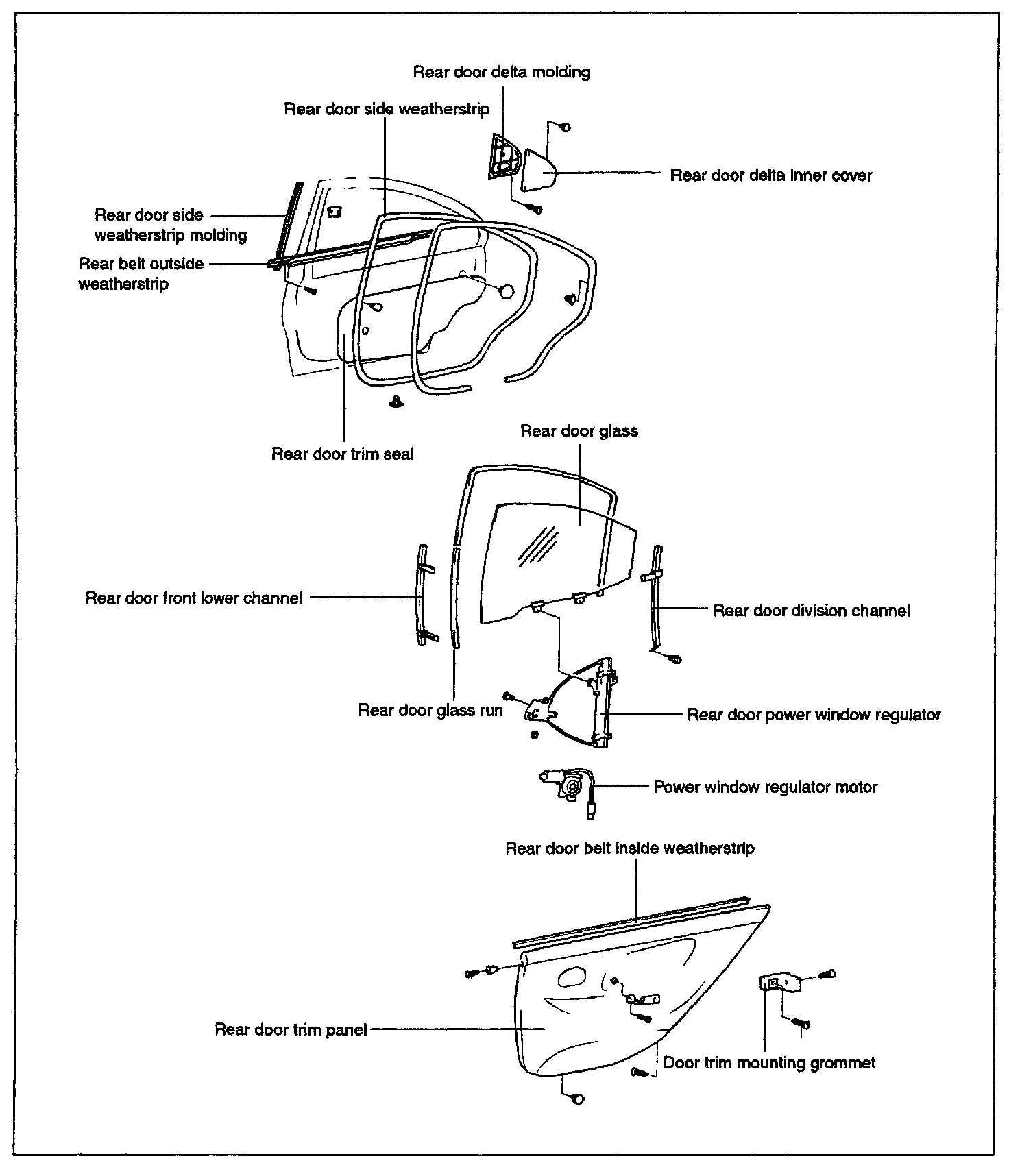 Rear door glass mounting bolts: 8-12 Nm (80-120 kg.cm, 5.8-8.7 lb.ft)