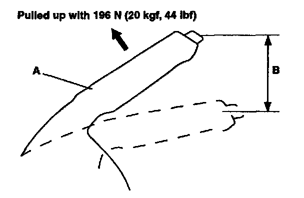 1. Pull the parking brake lever (A) with 196 N (20 kgf, 44 ft. lbs.) force to fully apply the parking brake. The parking brake lever should be locked within the specified number of clicks (B)