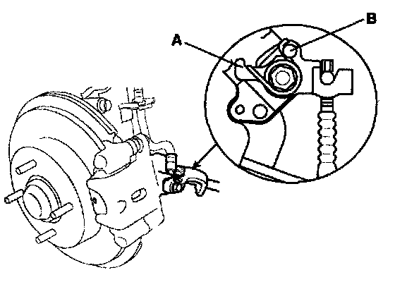 2. Make sure the parking brake arm (A) on the rear brake caliper contacts the brake caliper pin (B).