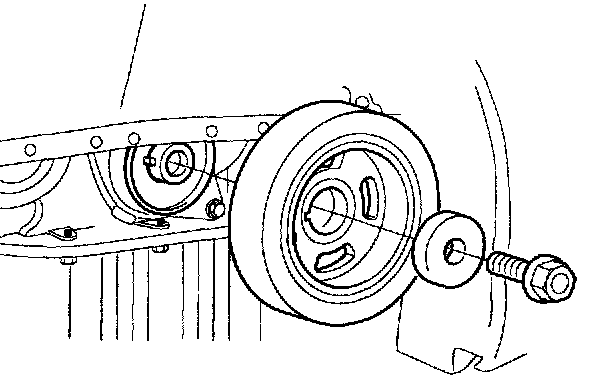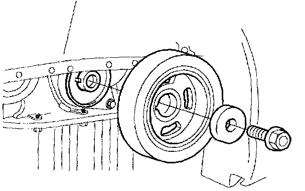 12. Install the flange and crankshaft pulley. Make sure that crankshaft sprocket pin fits the small hole in the pulley.