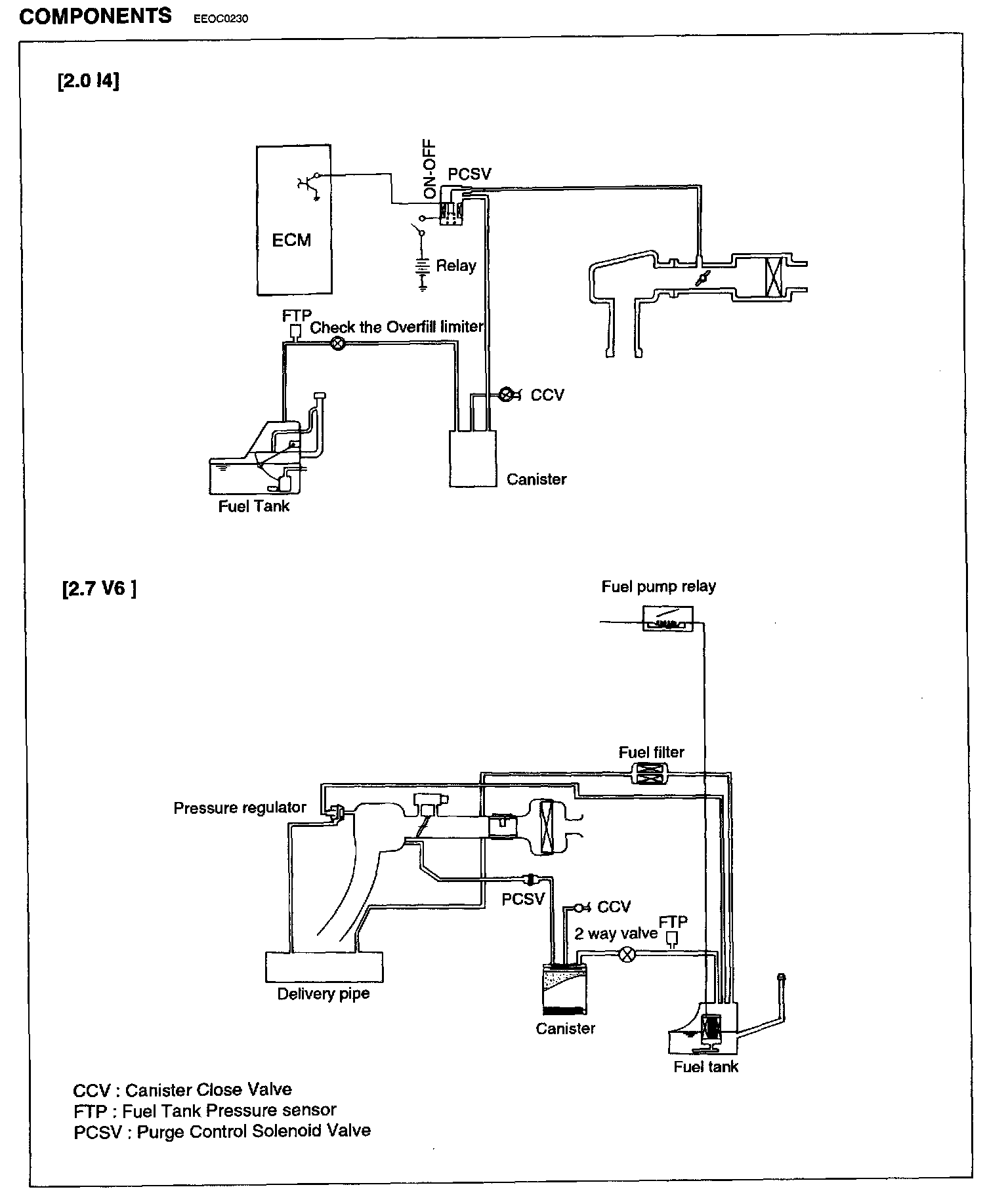 EVAPORATIVE AND OVER EMISSION CONTROL SYSTEMOn-Board Refueling Vapor Recovery (ORVR) system is properly designed to prevent the fuel tank vapor(HC) emission during refueling at the gas station. This system consists of fill vent valve(ORVR), fuel shut-off valve, fuel cut valve(roll over), two way valve (pressure/vacuum relief), fuel liquid/vapor separator which is installed beside the filler pipe, charcoal canister which is mounted under the rear floor LH side member with protector, tubes and miscellaneous connections. While refueling, the flow and column of the refueling draws the ambient air into the filler pipe so as not to emit fuel vapor in the air. The fuel vapor in the tank is then forced to flow into the canister via the fill vent valve and the fuel liquid/vapor separator which isolates liquid fuel ingredient and transfers the pure vapor to the carbon canister. While the engine is operating, the trapped vapor emission in the canister is drawn and fed by the intake manifold vacuum into the engine combustion chamber. According to this purge process, the carbon canister is purged and recovers its absorbing capability.