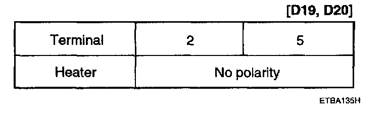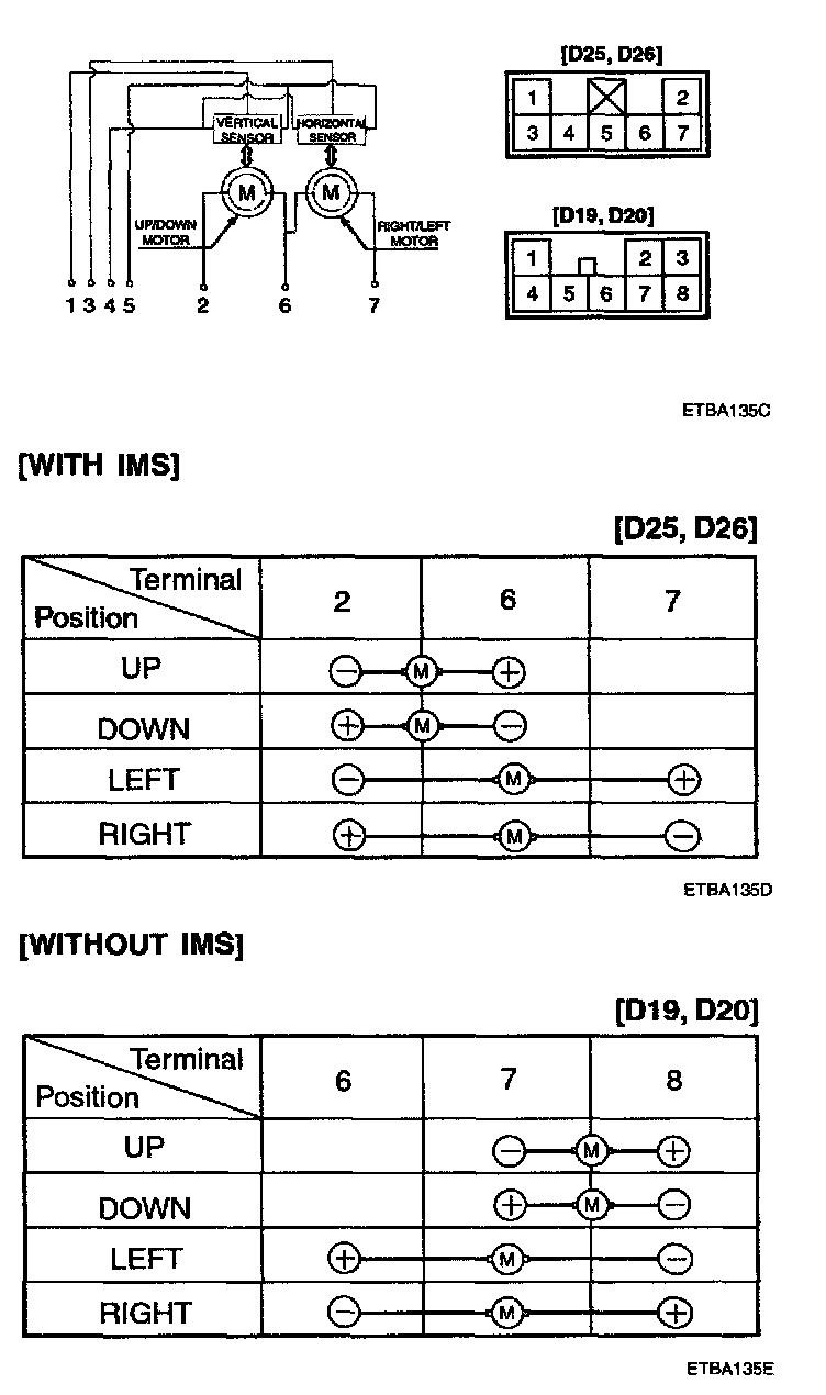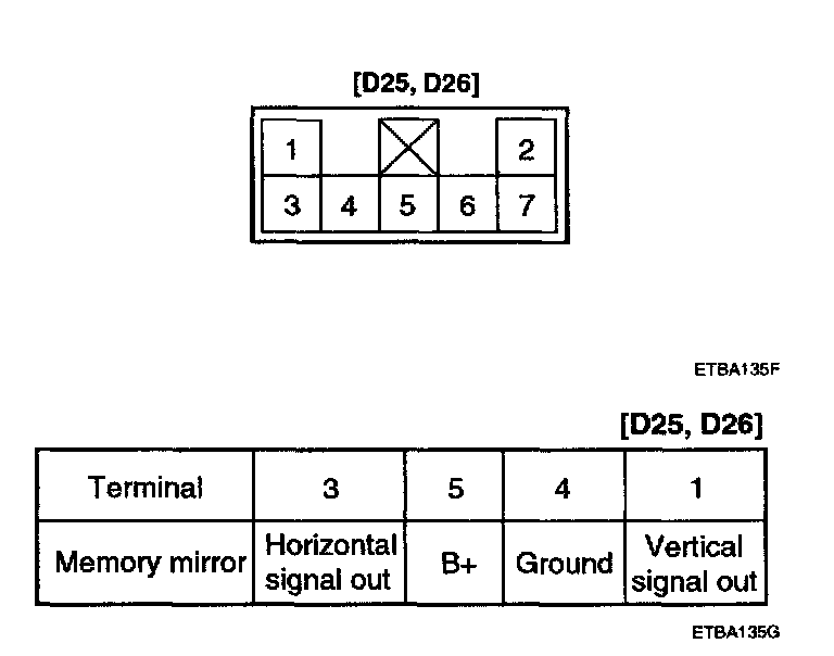 2. Apply battery voltage to each terminal as shown in the table and verify that the mirror operates properly.