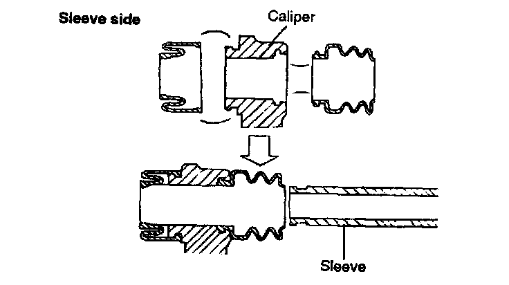 1. Apply rubber grease to the outside surface of the sleeve and pin, pin and sleeve bore of the caliper, pin boot and sleeve boot.