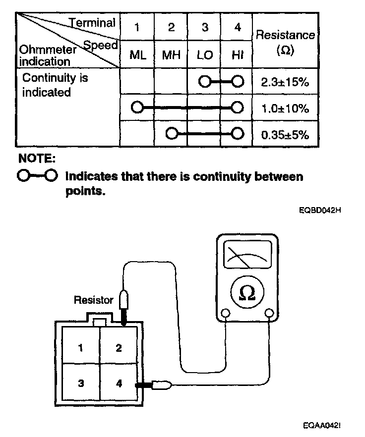 Measure terminal-to-terminal resistance of the blower resistor. If measured resistance is not within specification, the blower resistor must be replaced. (After removing the resistor)
