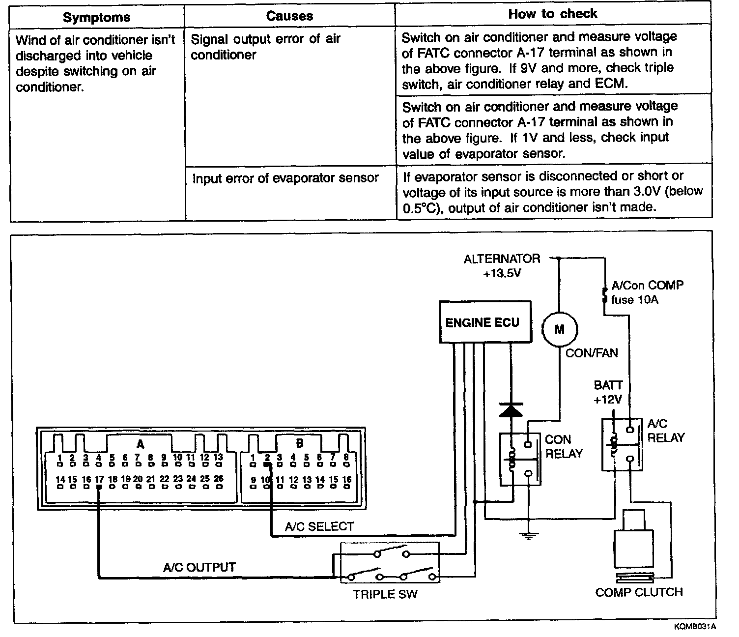 11 V is outputted from connector A-17 terminal in turning on INSULATING and pressing air conditioner switch. However, although 11 V is outputted from FATC connector A-17 terminal, compressor clutch isn't driven. Wind of air conditioner is discharged it only compressor clutch works. Output signal from air conditioner is inputted in engine computer through triple switch. Then, the engine computer considers several conditions and when output of air conditioner is judged to be practical, it gives GND to signal terminal of air conditioner relay. Accordingly, relay of air conditioner is ON and compressor clutch works. Triple switch checks pressure of refrigerant flowing through pipe and turns on/off switches in it according to standard. So, it controls that output signal of air conditioner outputted from FATC is inputted into engine computer, and also speed of condenser fan according to pressure level. (For high pressure, high-speed and for low pressure, low-speed)