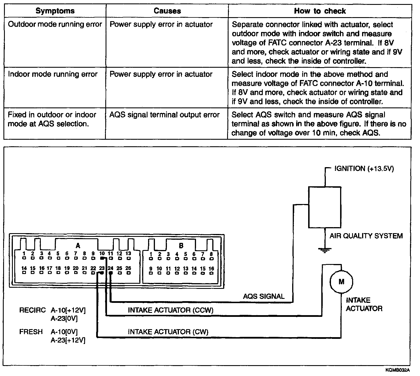 In turning on IG and selecting outdoor mode with indoor switch, 12 V is outputted from FATC connector A-23 terminal, 0 V is supplied for A-10 terminal and motor works in direction of outdoor. In selecting indoor mode with indoor switch, 12 V is outputted from FATC connector A-b terminal, 0 V is supplied for A-23 terminal and motor works in direction of indoor.