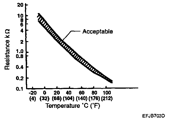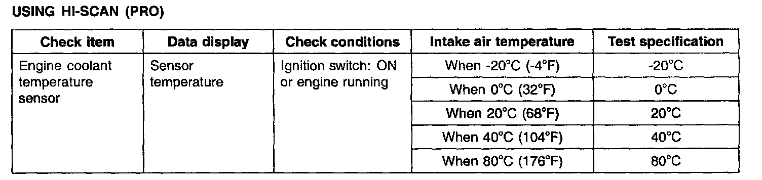 The engine coolant temperature sensor installed in the engine coolant passage of the cylinder head detects the engine coolant temperature and emits signals to the PCM. This part employs a thermistor which is sensitive to changes in temperature. The electric resistance of the thermistor decreases in response to a temperature rise (NTC). The PCM determines engine coolant temperature by the sensor output voltage and provides optimum fuel enrichment when the engine is cold.