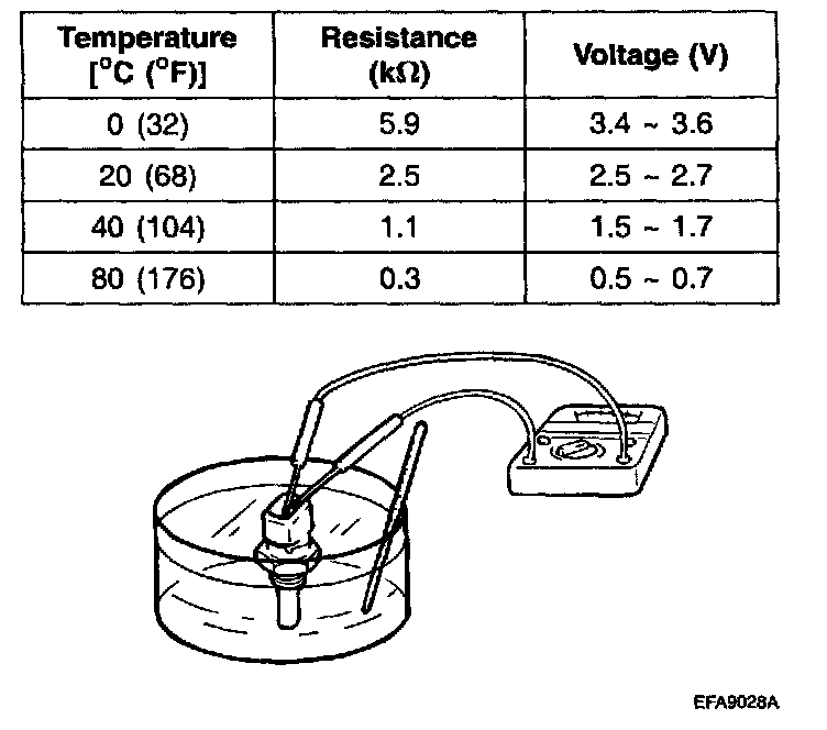 2. With the temperature sensing portion of the engine coolant temperature sensor immersed in hot engine coolant, check the resistance.