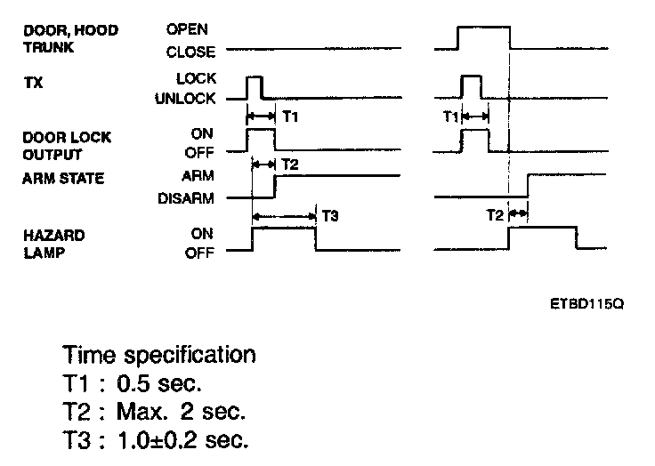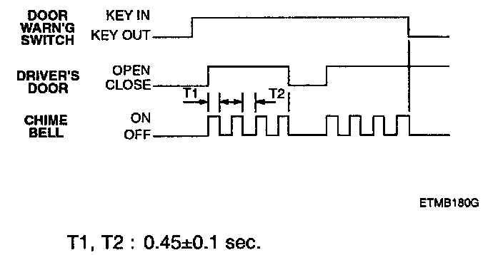 1. If the key is in the ignition key cylinder and the driver's door is opened, the chime bell sounds continually (period: 0.9 sec Duty rate: 50%).