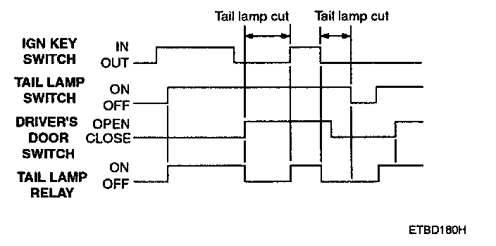 1. When the tail lamp is switched ON, if the ignition key switch is OFF and the driver's door is opened, the tail lamp should be automatically OFF.