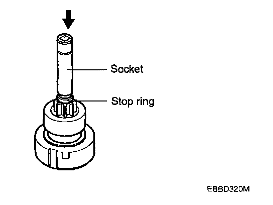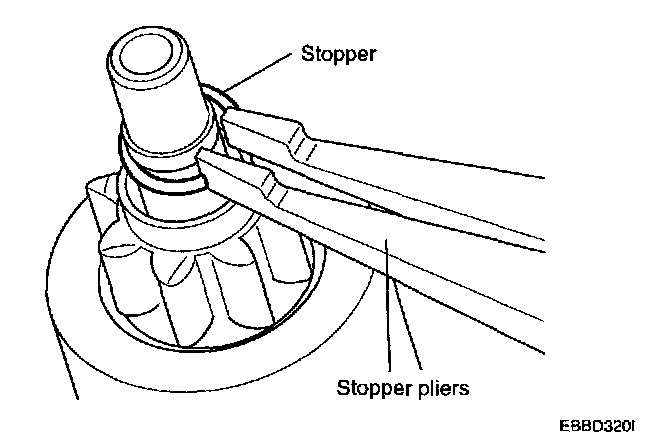 NOTE: Using a suitable pulling tool, pull the overrunning clutch stop ring over the stopper