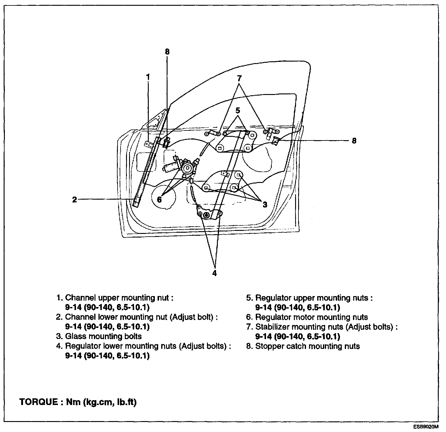 7. Adjust the door glass and tighten the bolts and nuts. (Refer to the glass adjustment procedure).