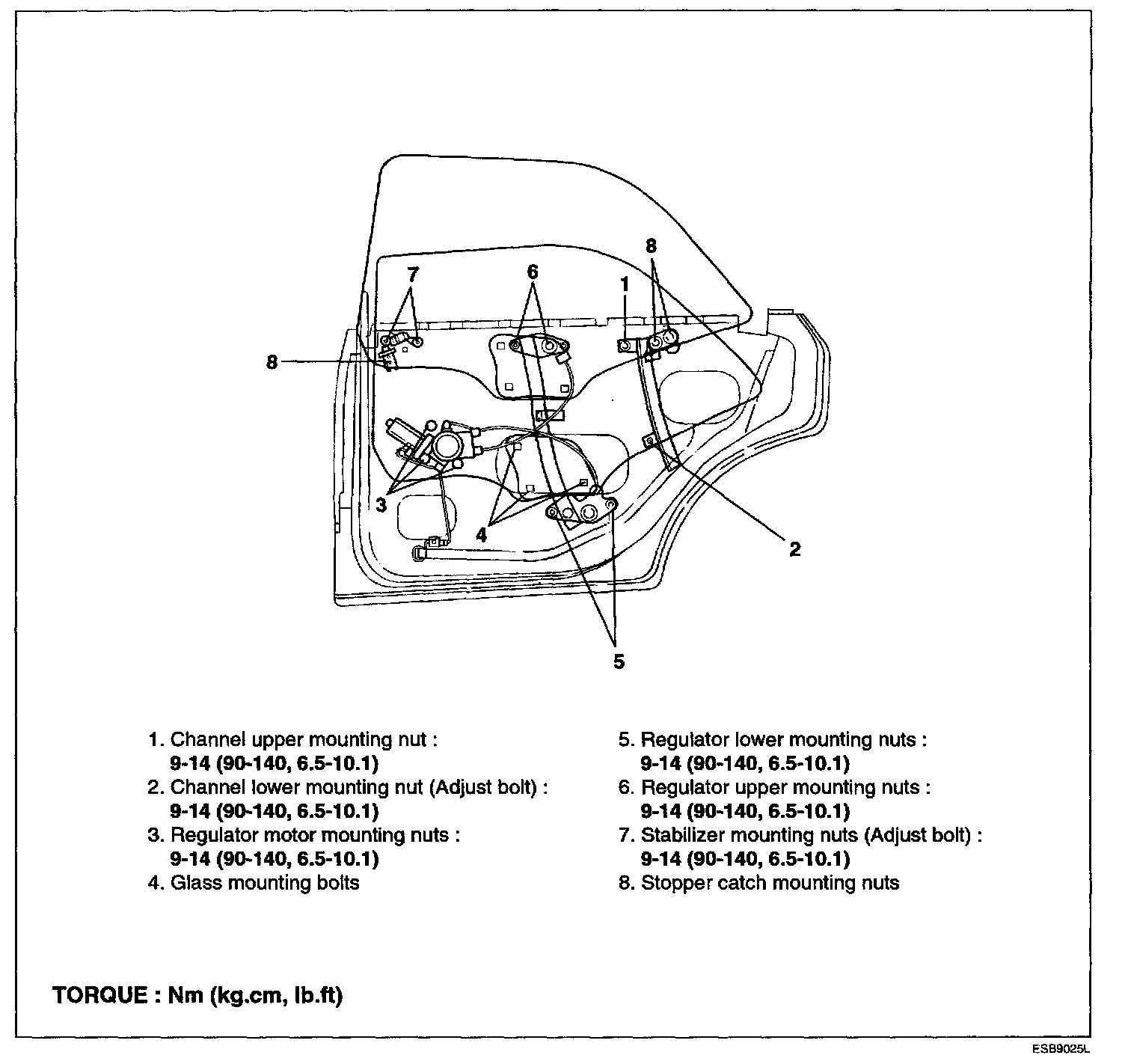 7. Adjust the door glass and tighten the bolts and nuts. (Refer to the glass adjustment procedure).