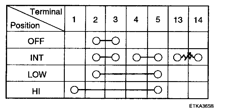 Check the switch for continuity between the terminals. If continuity is not as specified, replace the wiper and washer switch.