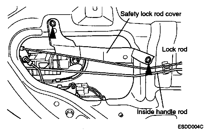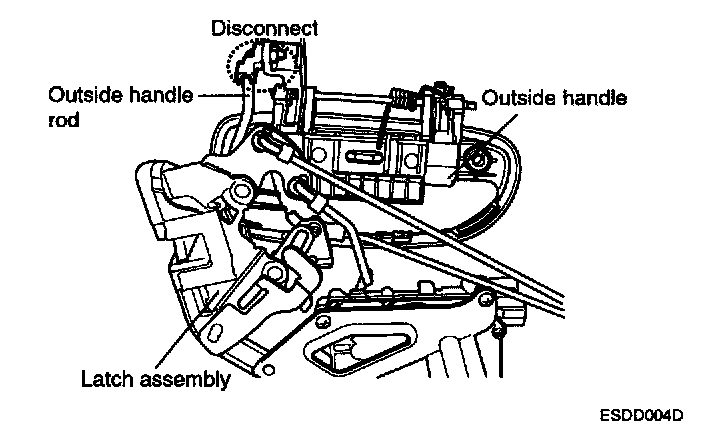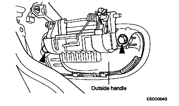 6. Loosen the outside handle mounting bolts(2EA), disconnect the rod, and then remove the latch and outside handle.
