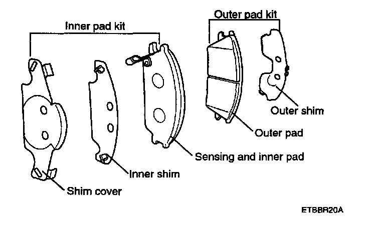 4. Install the new pads. The shims are attached to each pad as illustrated.