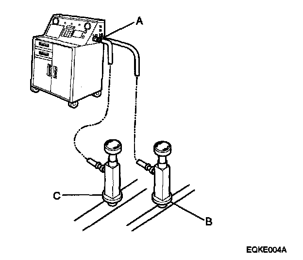 1. Connect a R-134a refrigerant recovery/recycling/charging station (A) to the high-pressure service port (B) and the low-pressure service port (C), as shown, following the equipment manufacturer's instruction.