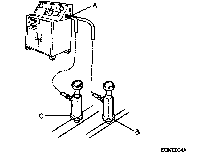 1. Connect a R-134a refrigerant recover/recycling/charging station (A) to the high-pressure service port (B) and the low-pressure service port (C), as shown, following the equipment manufacture's instructions.