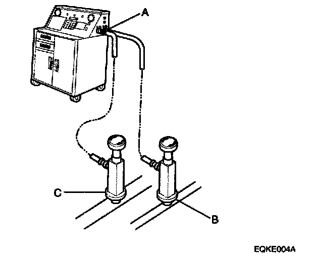 2. Connect a R-134a refrigerant recovery/recycling/charging station(A) to the high-pressure service port(B) and the low-pressure service port(C), as shown, following the equipment manufacturer's instruction. Evacuate the system.