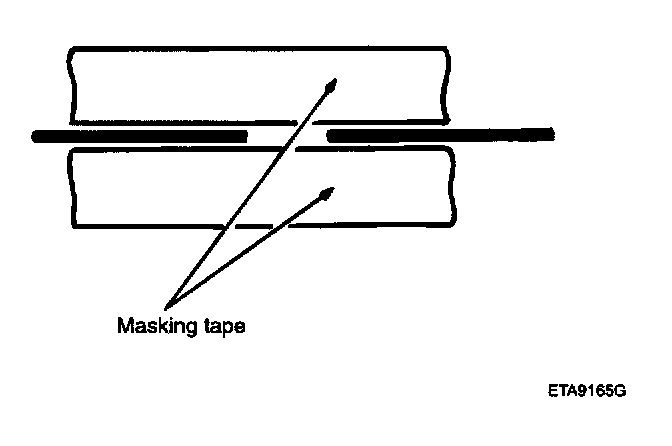 Wipe the glass adjacent to the broken heater line, clean with silicone remover and attach the masking tape as shown. Shake the conductive paint container well, and apply three coats with a brush at intervals of about 15 minutes apart. Remove the tape and allow sufficient time for drying before applying power. For a better finish, scrape away excess deposits with a knife after the paint has completely dried. (Allow 24 hours).