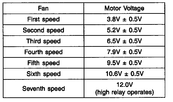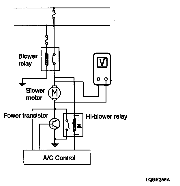 1. Manually operate the control switch and measure the voltage of blower motor between pin 1 and 2.