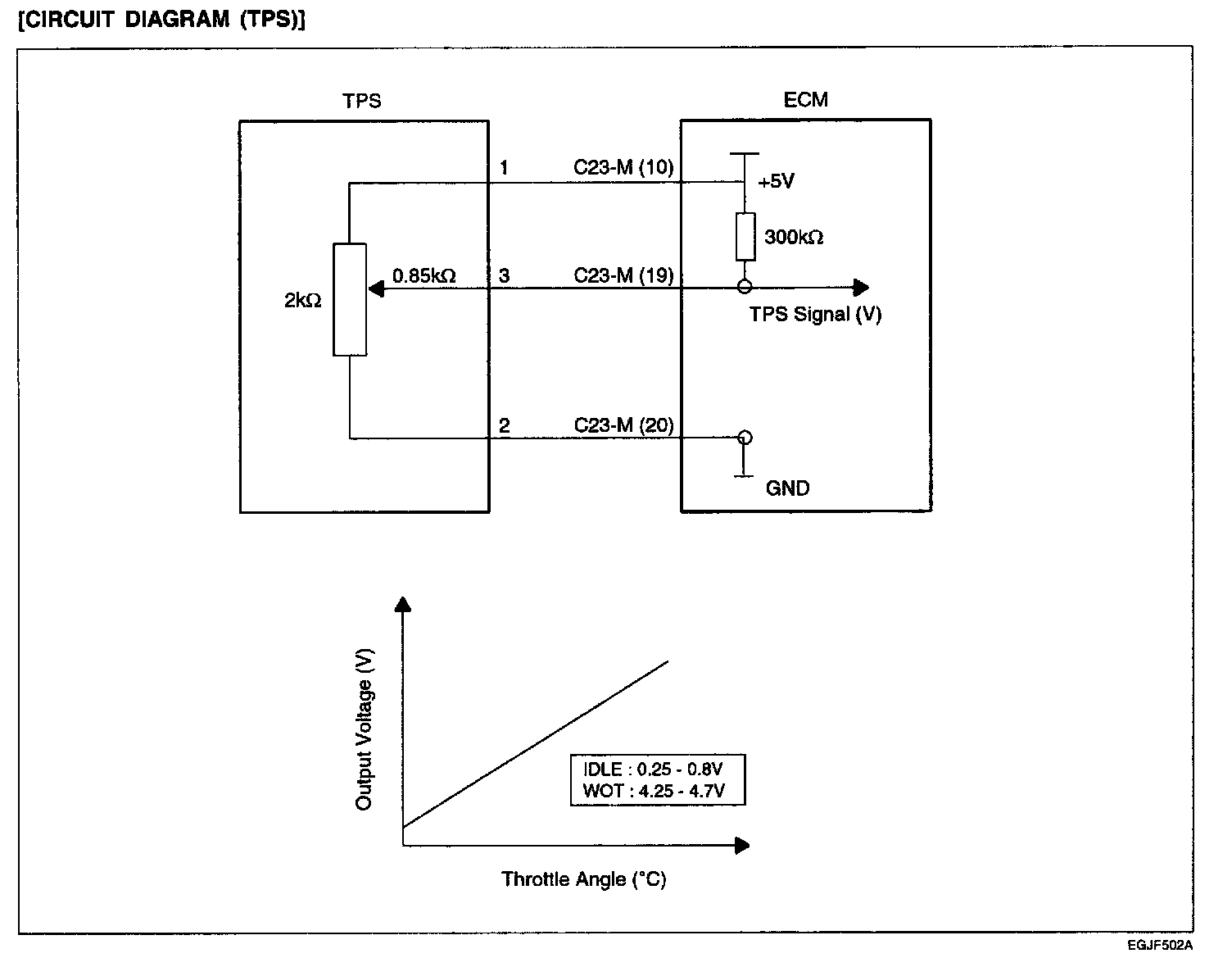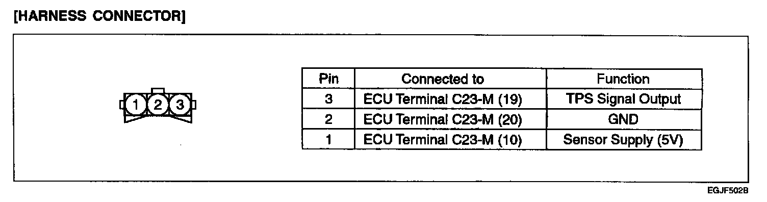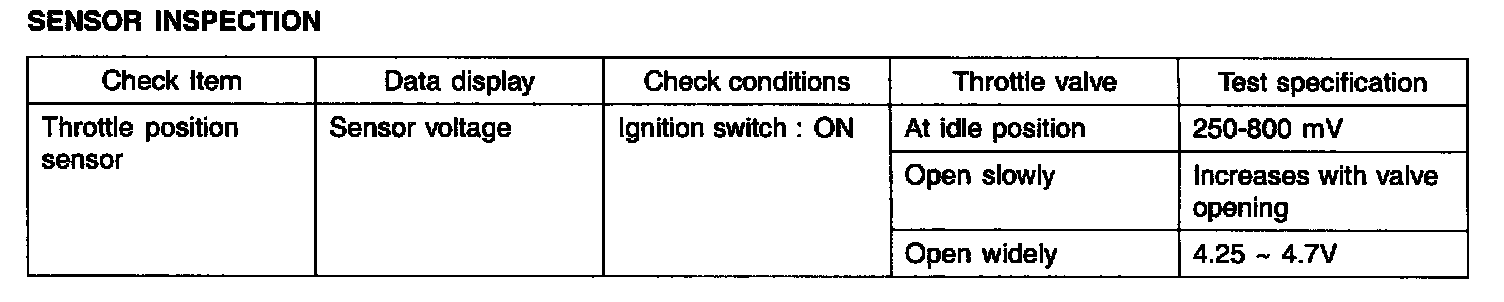 THROTTLE POSITION SENSOR (TPS)The TPS is a variable resistor type that rotates with the throttle body throttle shaft to sense the throttle valve angle. As the throttle shaft rotates, the output voltage of the TPS changes. The ECM detects the throttle valve opening based on voltage change.