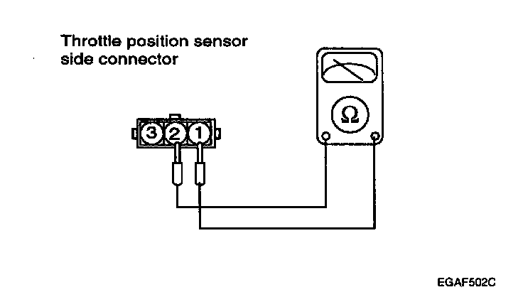 3. Connect a pointer type Ohms meter between terminal 2 (sensor ground) and terminal 1 (sensor output).