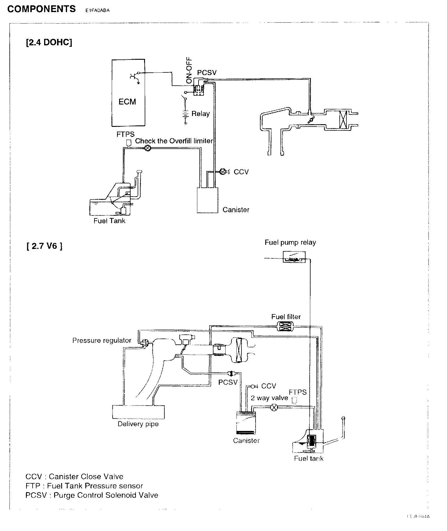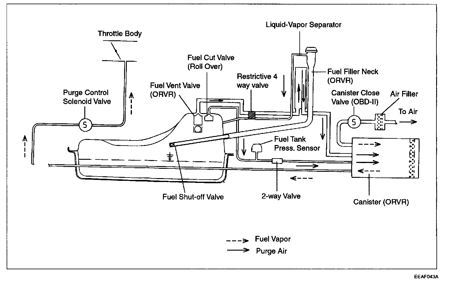 On-Board Refueling Vapor Recovery (ORVR) system is properly designed to prevent the fuel tank vapor (HC) emission during refueling at the gas station. This system consists of fuel vent valve (ORVR), fuel shut-off valve, fuel cut valve (roll over), two way valve (pressure/vacuum relief), fuel liquid/vapor separator which is installed beside the filler pipe, charcoal canister which is mounted under the rear floor LH side member with protector, tubes and miscellaneous connections. While refueling, the flow and column of there fueling draws the ambient air into the filler pipe so as not to emit fuel vapor in the air. The fuel vapor in the tank is then forced to flow into the canister via the fill vent valve and the fuel liquid/vapor separator which isolates liquid fuel ingredient and transfers the pure vapor to the carbon canister. While the engine is operating, the trapped vapor emission in the canister is drawn and fed by the intake manifold vacuum into the engine combustion chamber. According to this purge process, the carbonp canister is purged and recovers its adsorbing capability.
