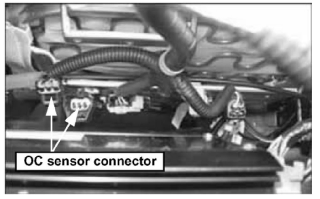3. Locate the OCS 3-pin connector under the front passenger seat pan and unplug the OCS connector by pushing on the locking tab and pulling the connector housing.