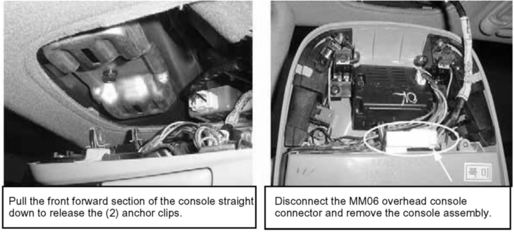a. Continue by removing the console from the roof panel and disconnecting the MM06 connector as shown.