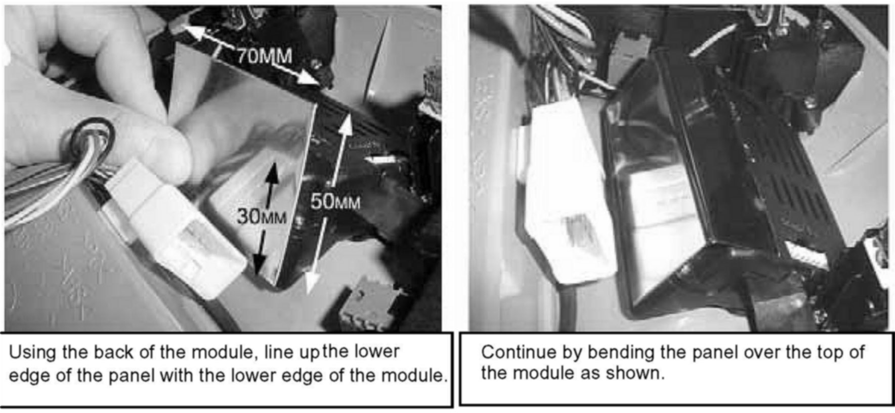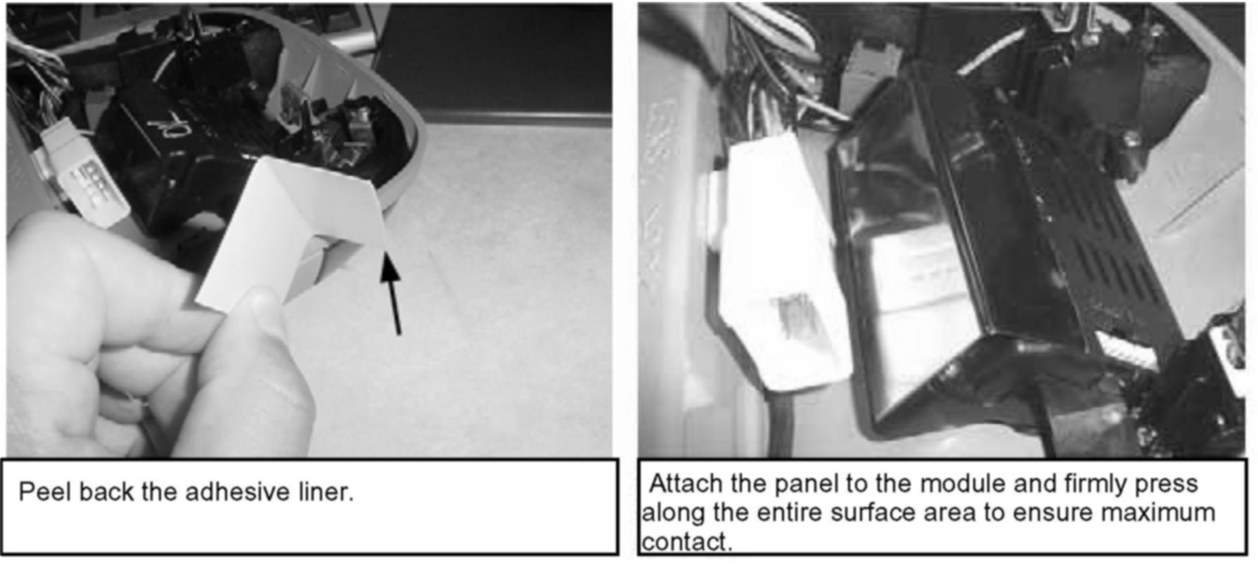 5. Peel back the adhesive liner and firmly attach the pre-bent shielding panel to the back of the module as shown.