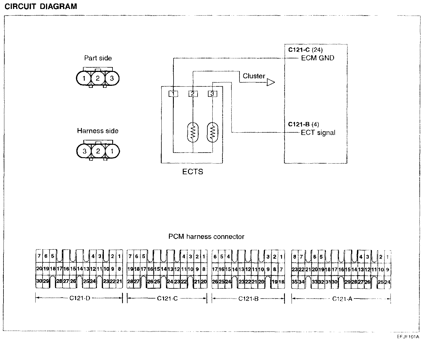 ENGINE COOLANT TEMPERATURE (ECT) SENSORThe engine coolant temperature sensor installed in the engine coolant passage of the cylinder head detects the engine coolant temperature and emits signals to the PCM. This part employs a thermistor which is sensitive to changes in temperature The electric resistance of the thermistor decreases in response to a temperature rise (NTC). The PCM determines engine coolant temperature by the sensor output voltage and provides optimum fuel enrichment when the engine is cold.