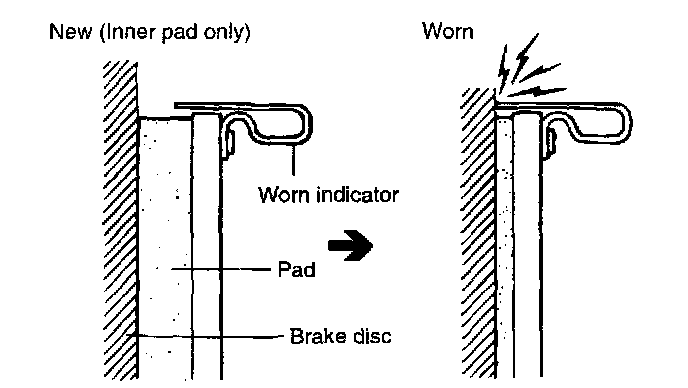 If a squeaking noise occurs from the front brake while driving and braking, inspect the brake pads