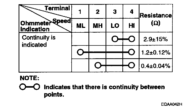 Measure terminal-to-terminal resistance of the blower resistor. If measured resistance is not within specification, the blower resistor must be replaced. (After removing the resistor).
