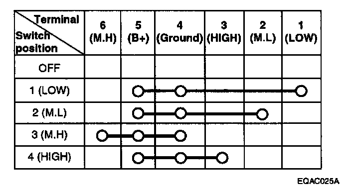 Blower Switch (Manual Temperature Control)Check for continuity between terminals as shown below.