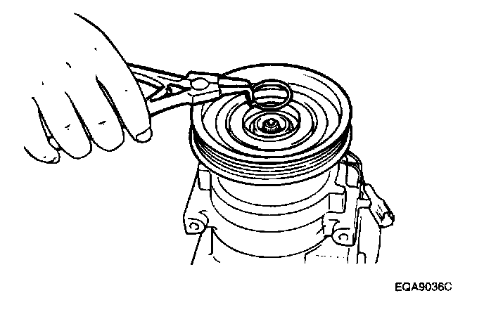 3. Remove the pulley retaining snap ring and then pull the pulley and bearing assembly from the compressor.