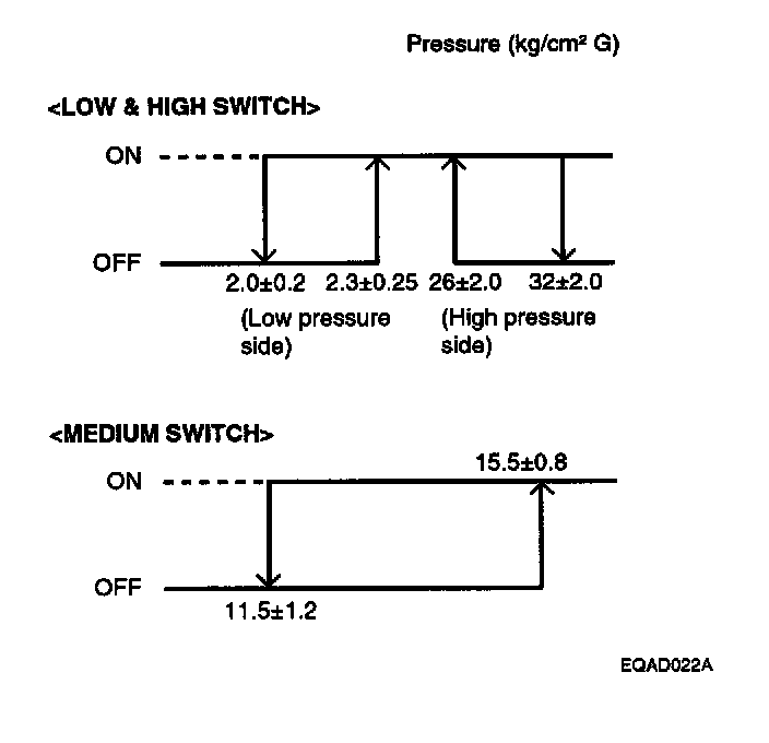 The triple pressure switch is a combination of the low pressure switch (for checking the quantity of refrigerant) and the high pressure switch (for prevention of air conditioning line burst) and medium pressure switch (for cooling fan operation). It is installed in the receiver drier and when the pressure becomes approximately 200 kPa (29 psi) or lower, the compressor stops, thus preventing the compressor from being damaged by sticking. When the pressure reaches 1,800 kPa (261 psi) or higher, the cooling fans run high speed from low speed, thus preventing the power consumption of cooling fans from being discharged. When the pressure reaches 3,241 kPa (470 psi) or higher, the compressor stops, thus preventing air conditioning line burst. There is generally no necessity for inspection; if, however, an unusual condition, such as nonoperation of the compressor is encountered, check by following the procedures below.