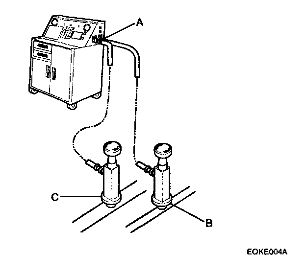 1. Connect a R-134a refrigerant recovery/recy- cling/charging station (A) to the high-pressure service port(B) and the low-pressure service port(C), as shown, following the equipment manufacturer 5 instruction.