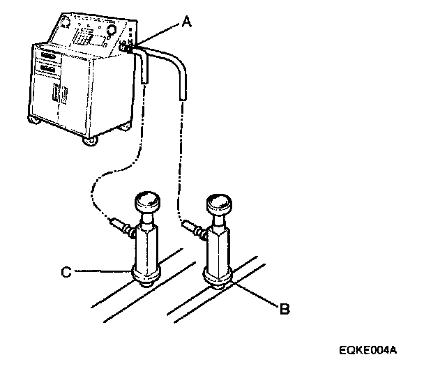2. Connect a R-134a refrigerant recovery/recycling/charging station(A) to the high-pressure service port(B) and the low-pressure service port(C), as shown, following the equipment manufacturer's instruction. Evacuate the system.