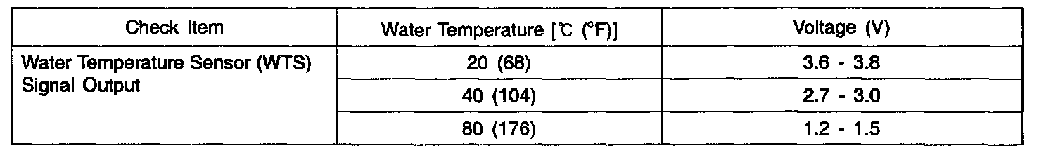 Engine Coolant Temperature Sensor (ECTS) installed in the engine coolant passage of the cylinder head detects the engine coolant temperature and emits signals to the ECM. This part employs a thermistor which is sensitive to changes in temperature. The electric resistance of the thermistor decreases in response to a temperature rise (NTC). The ECM determines engine coolant temperature by the sensor output voltage and provides optimum fuel enrichment when the engine is cold.