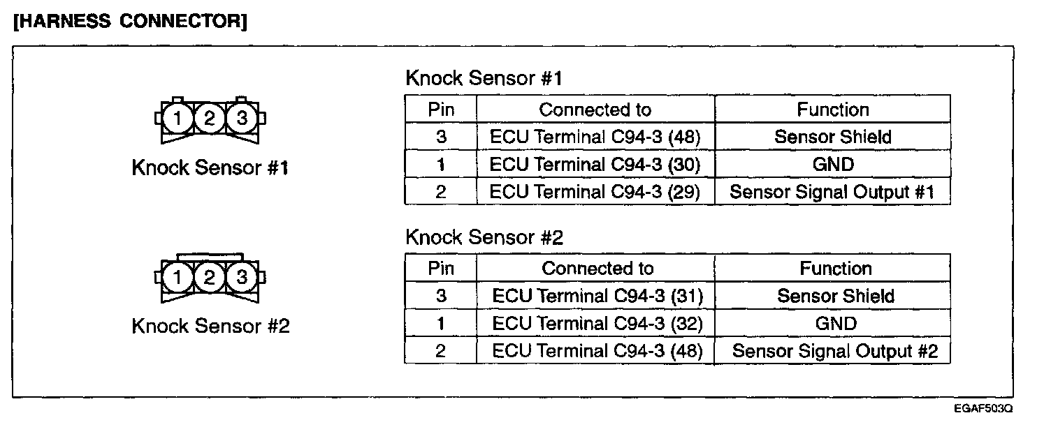 The knock sensor is a piezoetectric device attached to the cylinder block that senses pressure from engine knock conditions. This vibrational pressure is then converted into a voltage signal which is delivered as output. It engine knock occurs, ignition timing is retarded to suppress it.