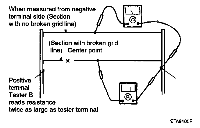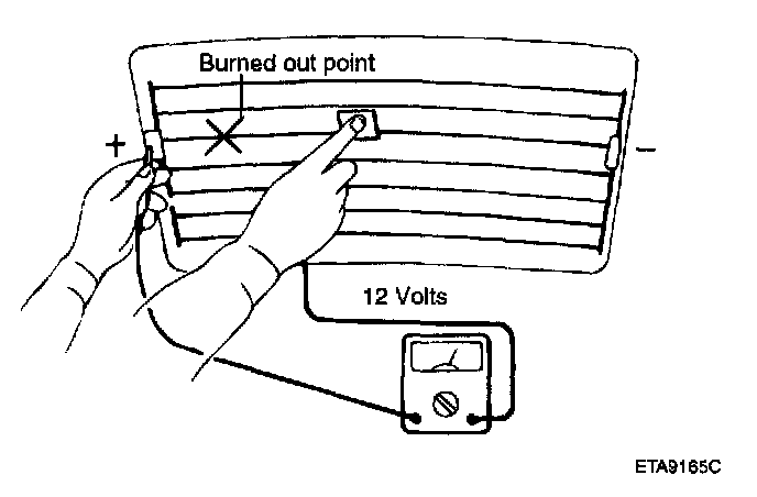 5. Use an ohmmeter to measure the resistance of each heater line between a terminal and the center of a grid line, and between the same terminal and the center of one adjacent heater line. The section with a broken heater line will have a resistance twice as that in other sections. In the affected section, move the test lead to a position where the resistance sharply changes.