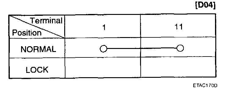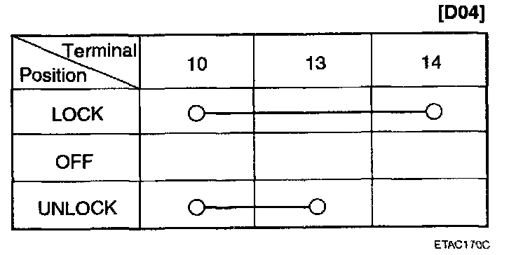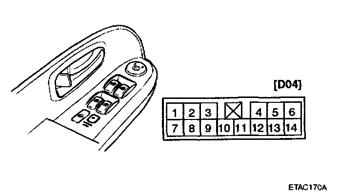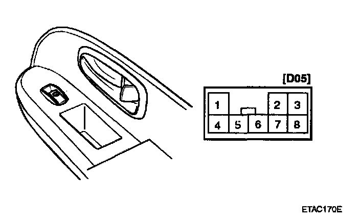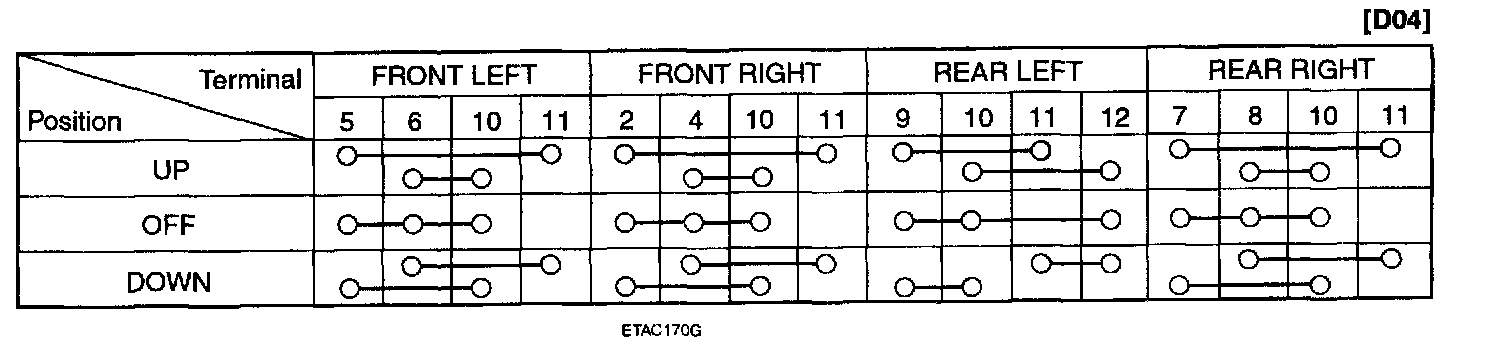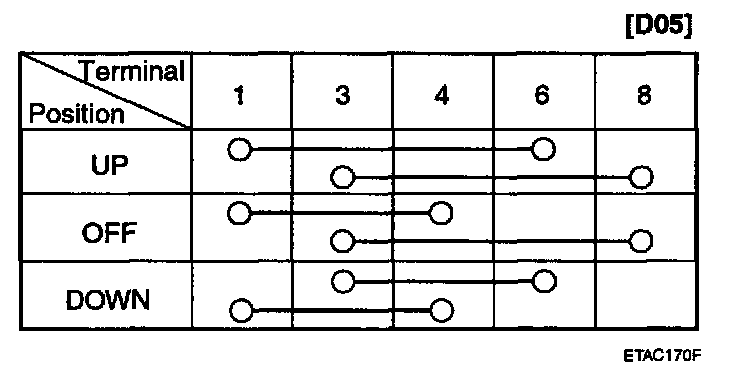 2. Check for continuity between the terminals. If continuity is not as specified in the table, replace the power window switch.