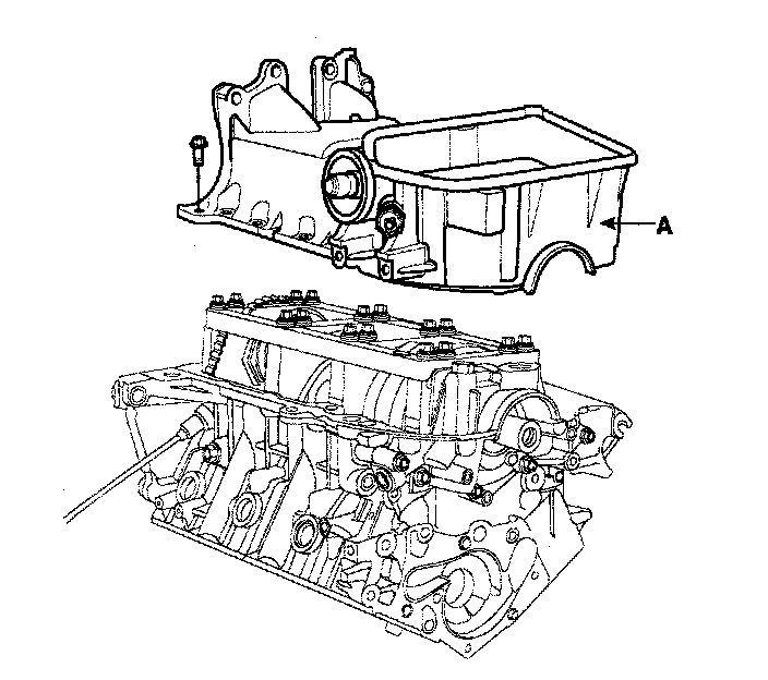 2) Install the oil pan (A) with the 17 bolts. Uniformly tighten the bolts in several passes.