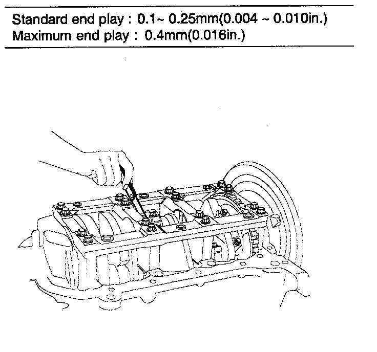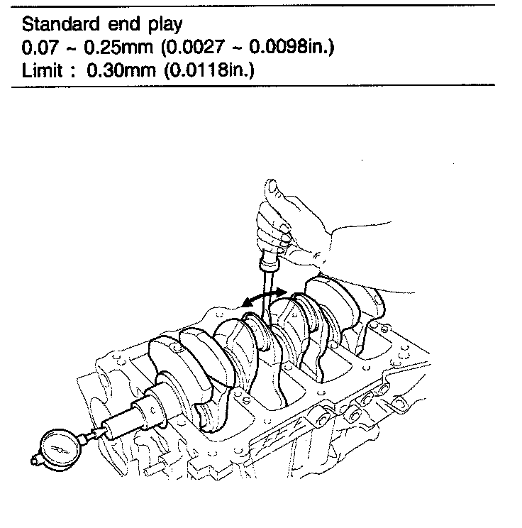 1. Check the connecting rod end play. Using a dial indicator, measure the end play while moving the connecting rod back and forth.