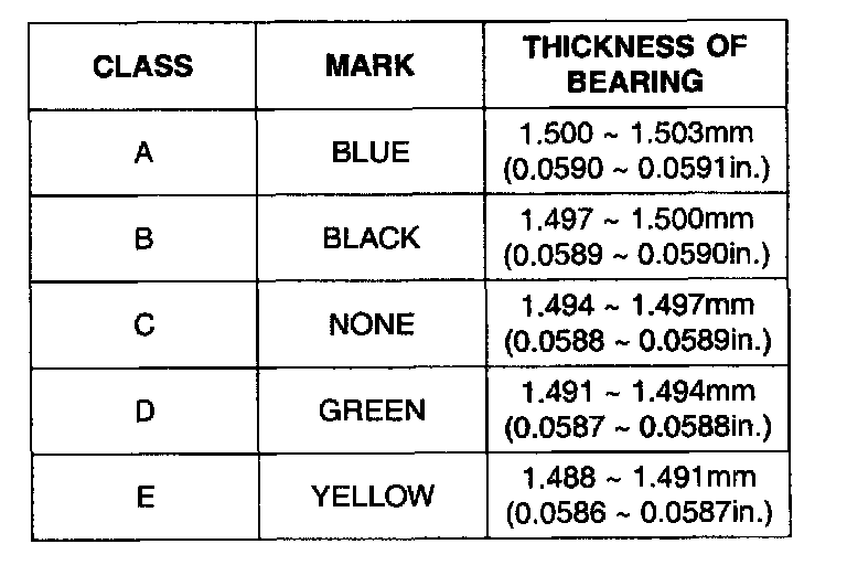 6) If the plastigage measures too wide or too narrow, remove the upper half of the bearing, install a new, complete bearing with the same color mark (select the color as shown in the next column), and recheck the clearance.
